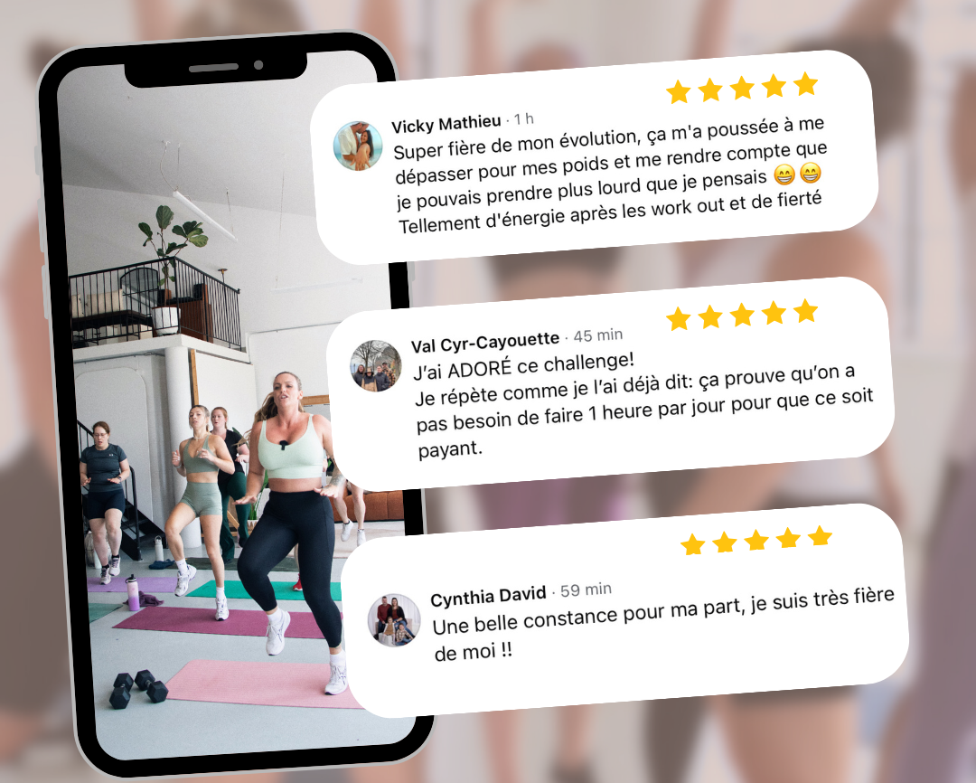 Nos entraînements en ligne sont sans aucun doute les favoris de toutes! Des séances courtes, simples à comprendre et surtout, très efficaces! Chaque entraînement est accompagné par une entraîneuse du début à la fin et peut, en plus, se glisser dans n’importe quel horaire. Tu trouveras pour chaque exercice une version débutante ou avancée, avec ou sans équipement. Chaque entraînement est adapté à ta réalité.